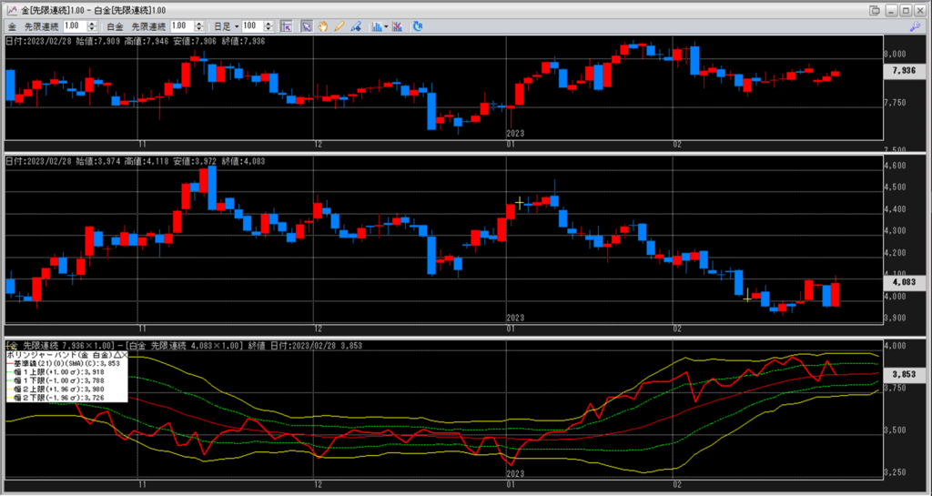 金白金の鞘をボリンジャーバンドで見ていきます。