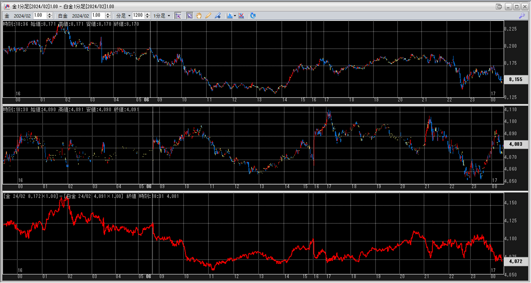 下:金白金鞘(金白金の価格差 = 金1グラムの価格 - 白金1グラムの価格)