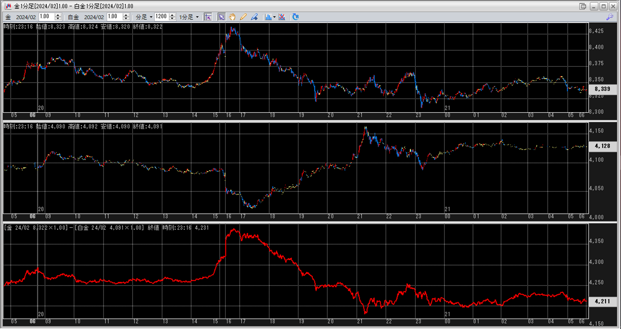 現在、鞘拡大の仕掛金買い1枚-白金売り2枚を3組、保持しています。