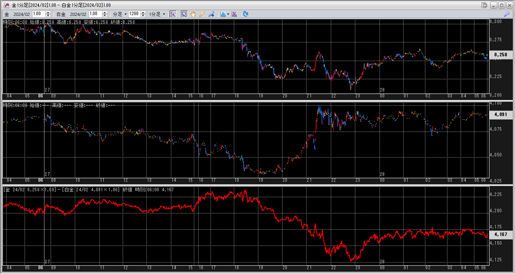下:金白金鞘(金白金の価格差 = 金1グラムの価格 - 白金1グラムの価格)