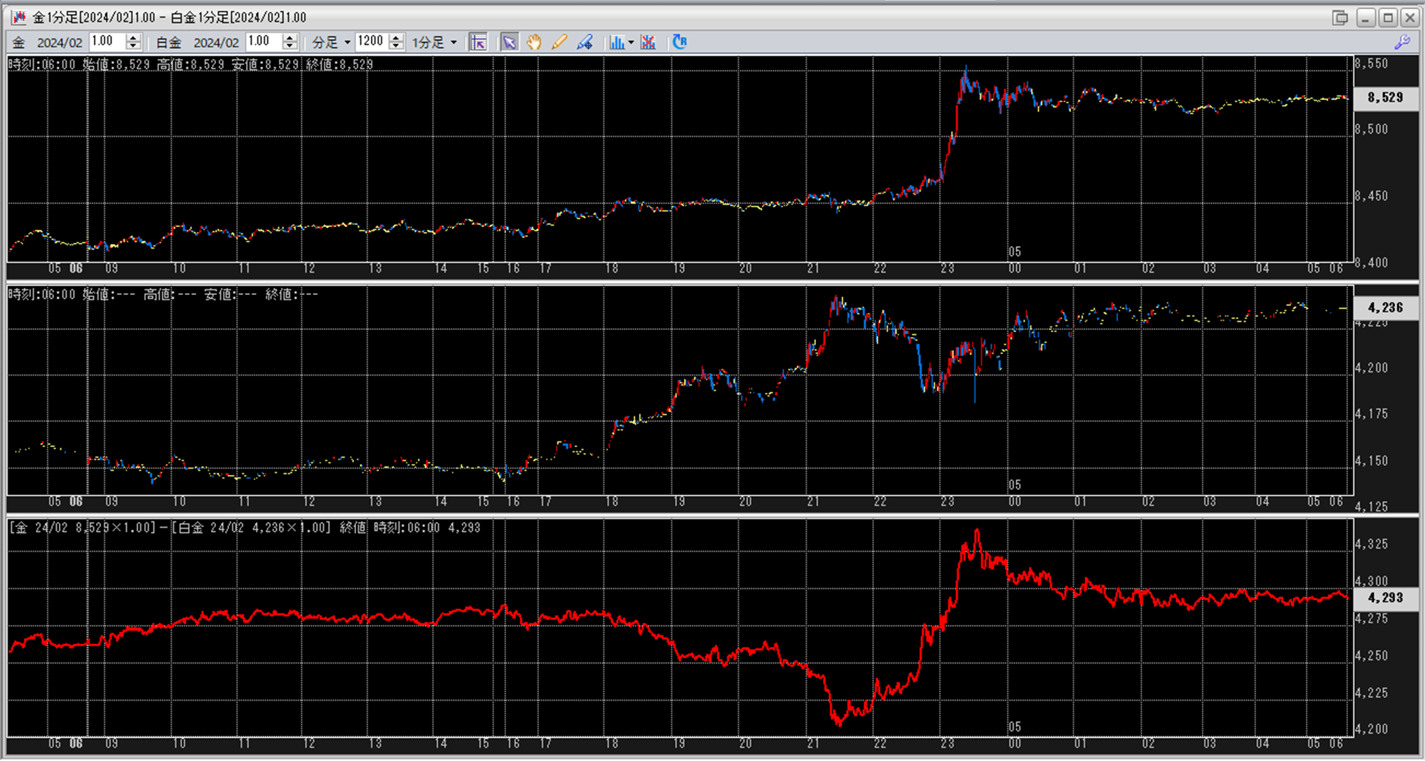 保持している鞘拡大の仕掛金買い1枚-白金売りの1組は含み益を維持しています。