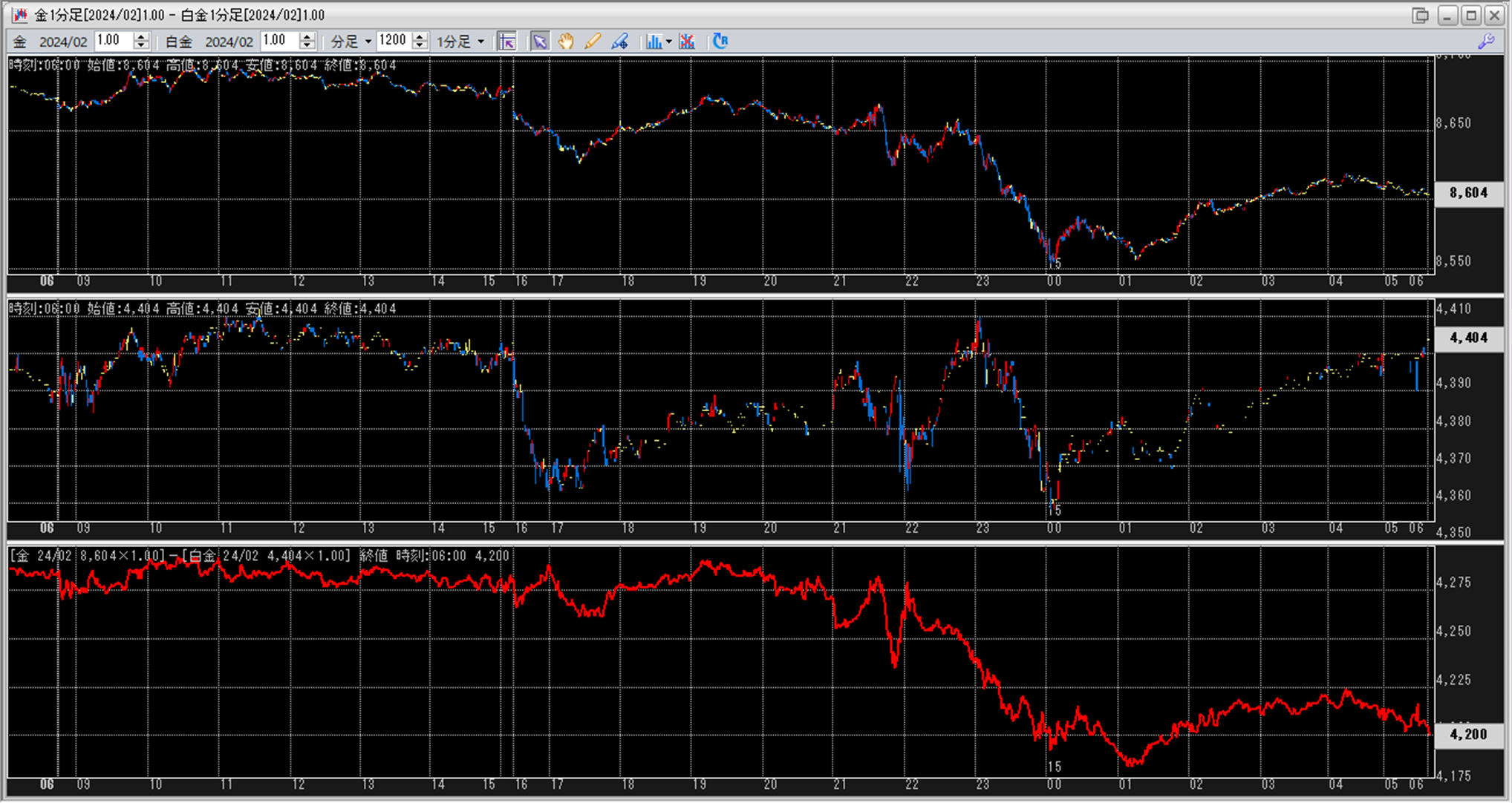 保持している鞘拡大の仕掛金買い1枚-白金売りの1組は含み益を維持しています。