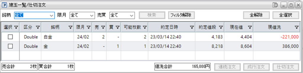 現在、鞘拡大の仕掛金買い1枚-白金売り2枚を1組、保持しています。