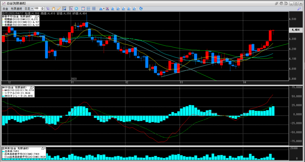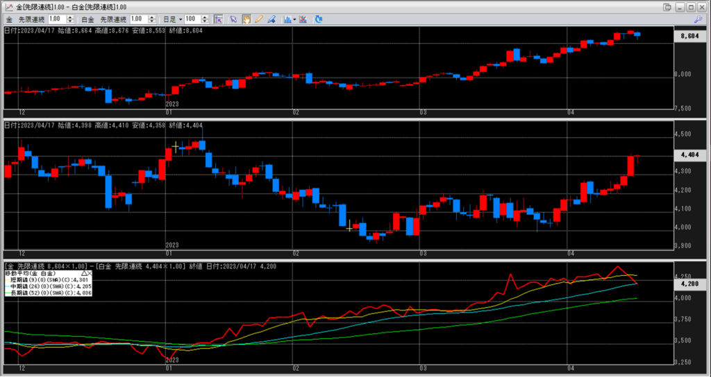 下記に金白金鞘の移動平均線のチャートを貼り付けています。