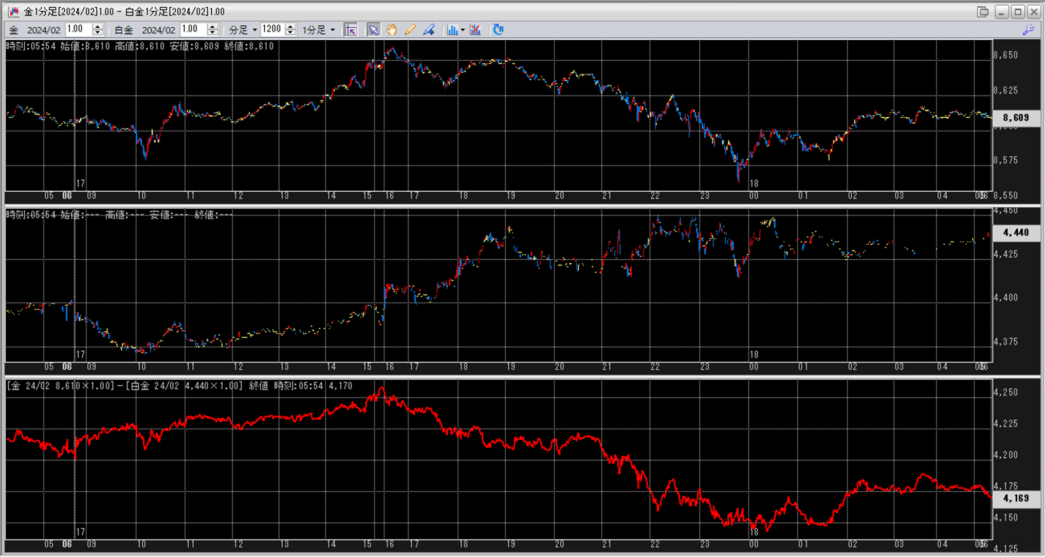 保持している鞘拡大の仕掛金買い1枚-白金売りの1組は含み益を維持しています。