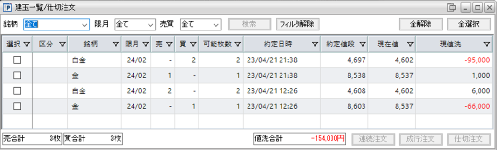 現在、鞘拡大の仕掛金買い1枚-白金売り2枚を1組、