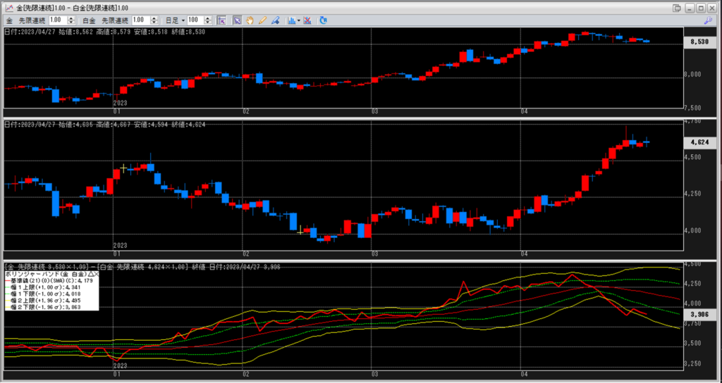 金白金の鞘をボリンジャーバンドで見ていきます。
