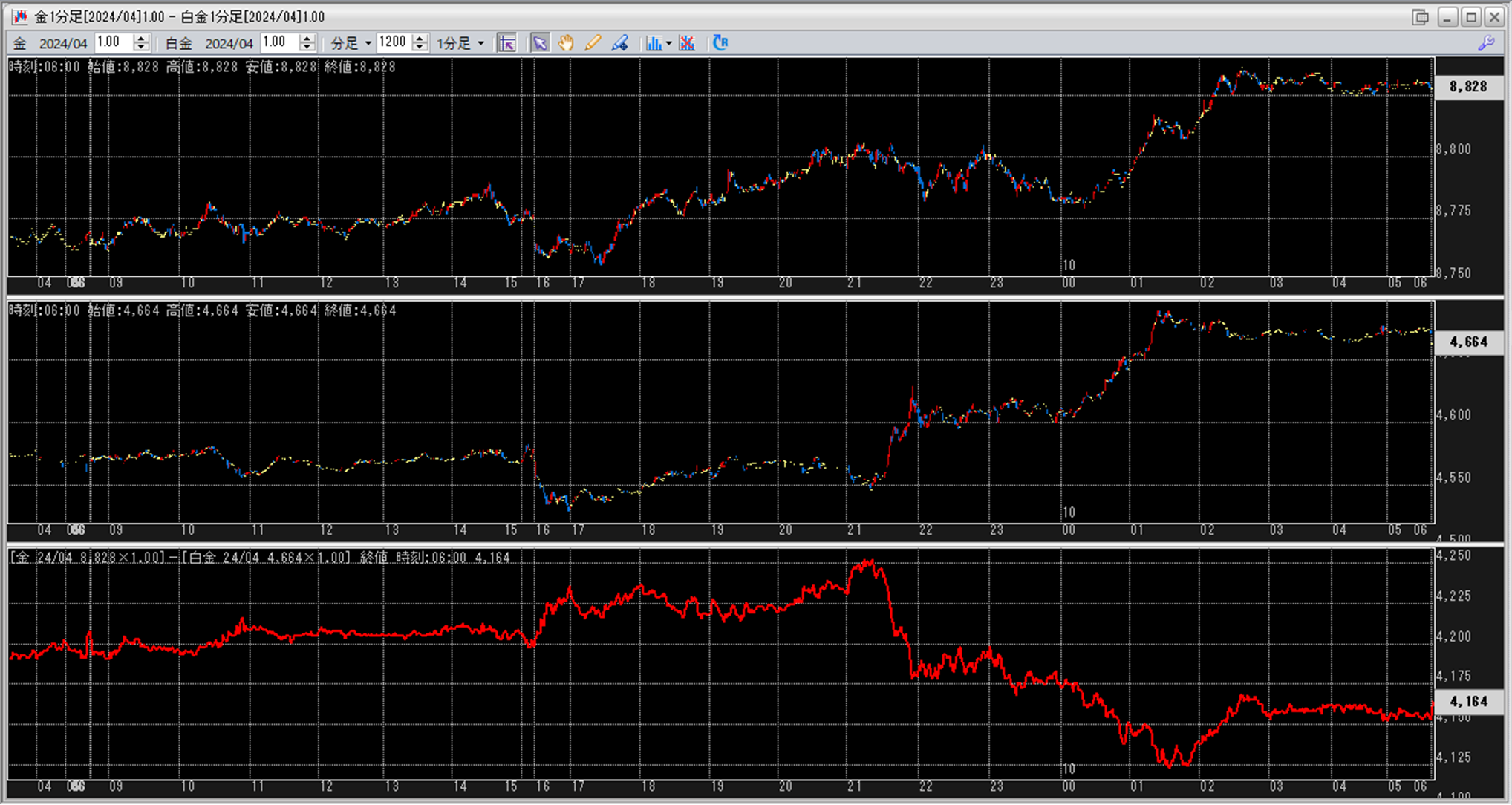 現在、鞘拡大の仕掛金買い1枚-白金売り2枚を2組、保持しています。