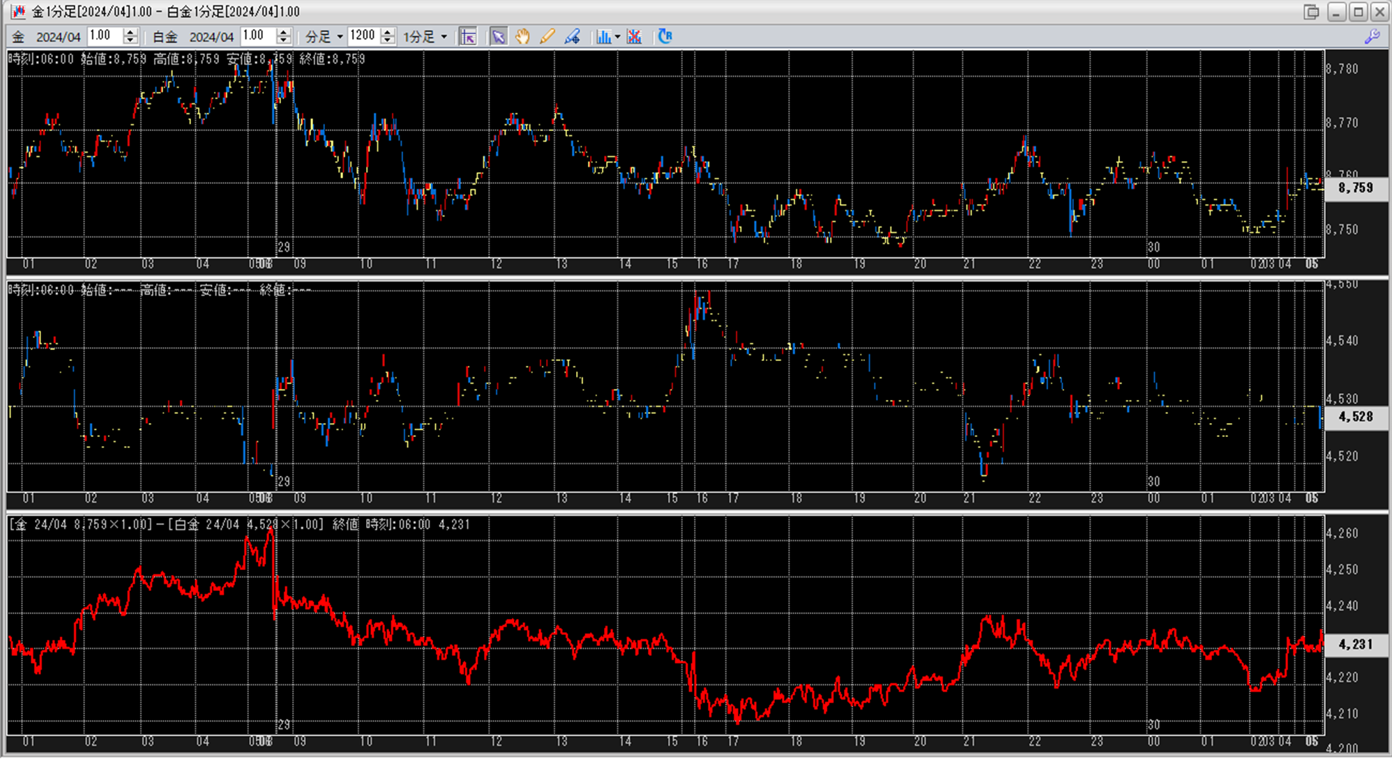 現在、金白金の鞘は、+1σである4,235円を割り込んだ4,231円で