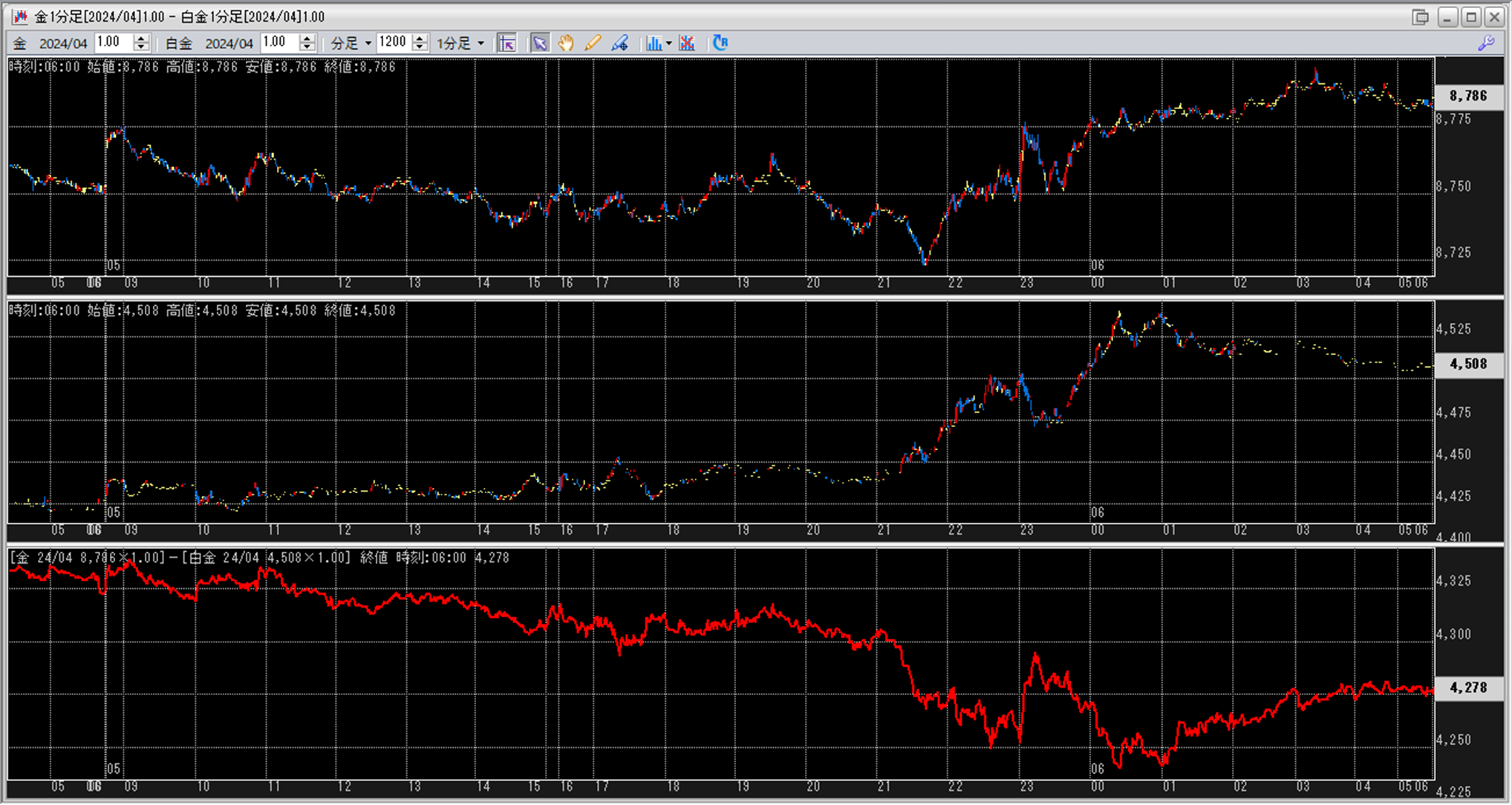 下:金白金鞘(金白金の価格差 = 金1グラムの価格 - 白金1グラムの価格)