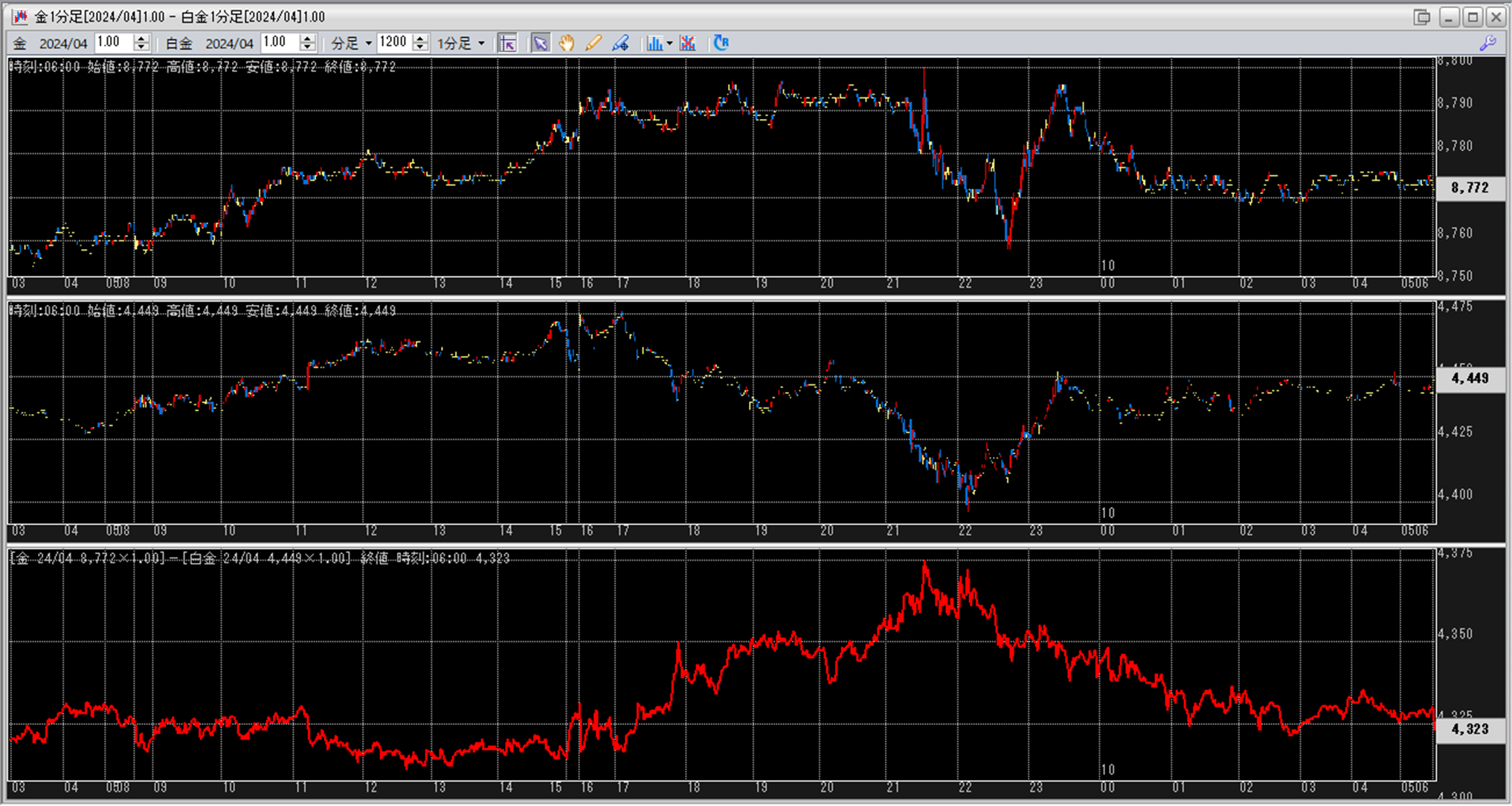 下:金白金鞘(金白金の価格差 = 金1グラムの価格 - 白金1グラムの価格)