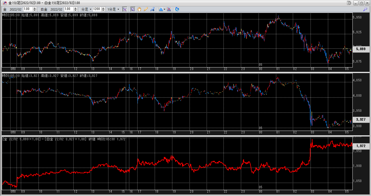 2021年3月4日8:45~3月5日5:30 金白金鞘値動きのチャートを張り付けています。