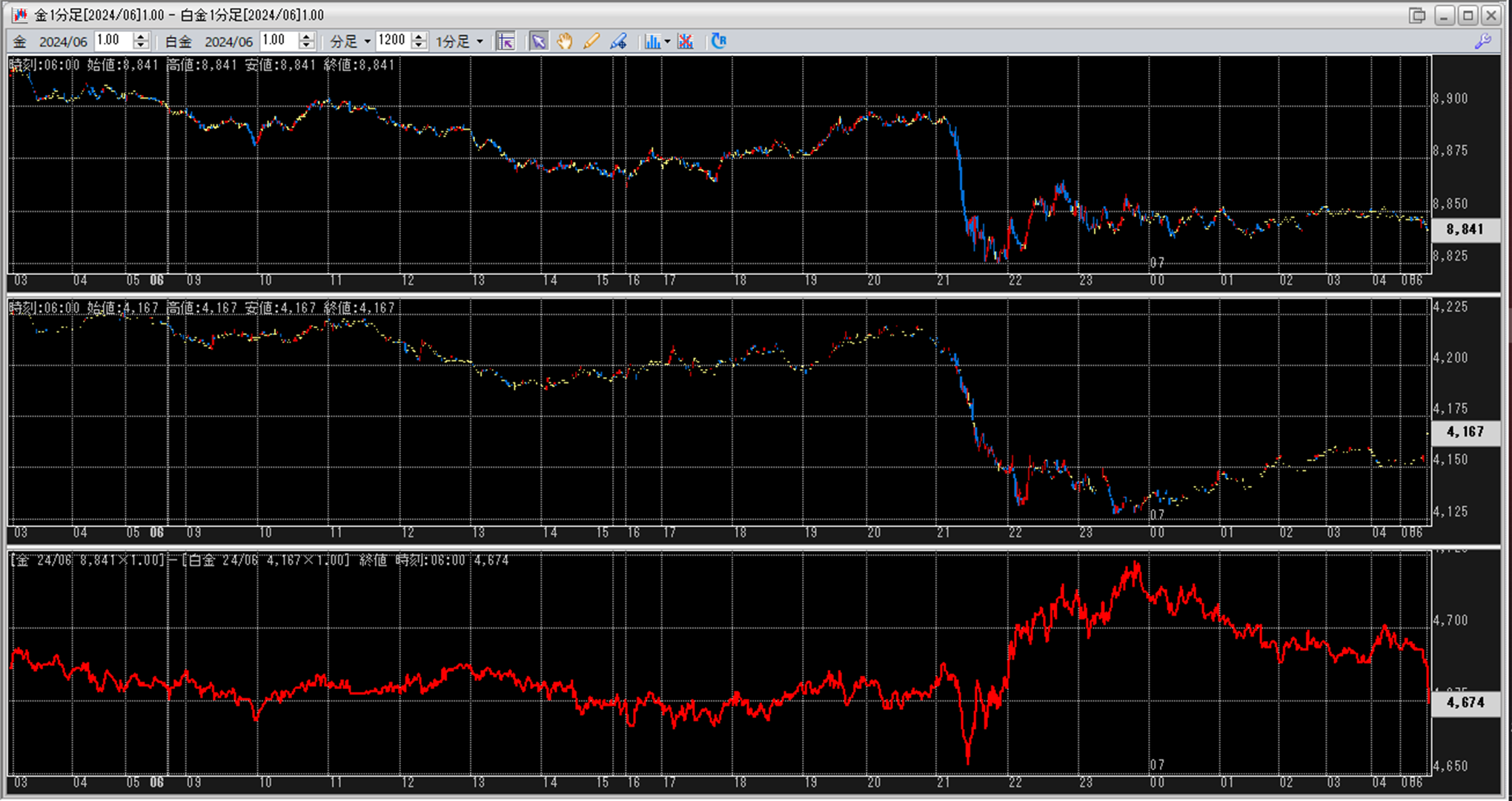 その直後に鞘が拡大し、慌てて、鞘拡大の仕掛金買い1枚-白金売り2枚を1組、建てました。