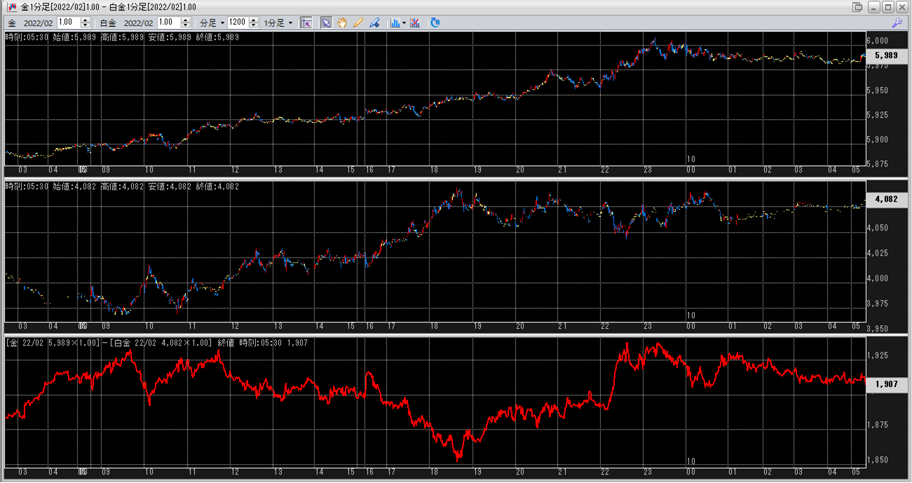 下:金白金鞘(金白金の価格差 = 金1グラムの価格 - 白金1グラムの価格)