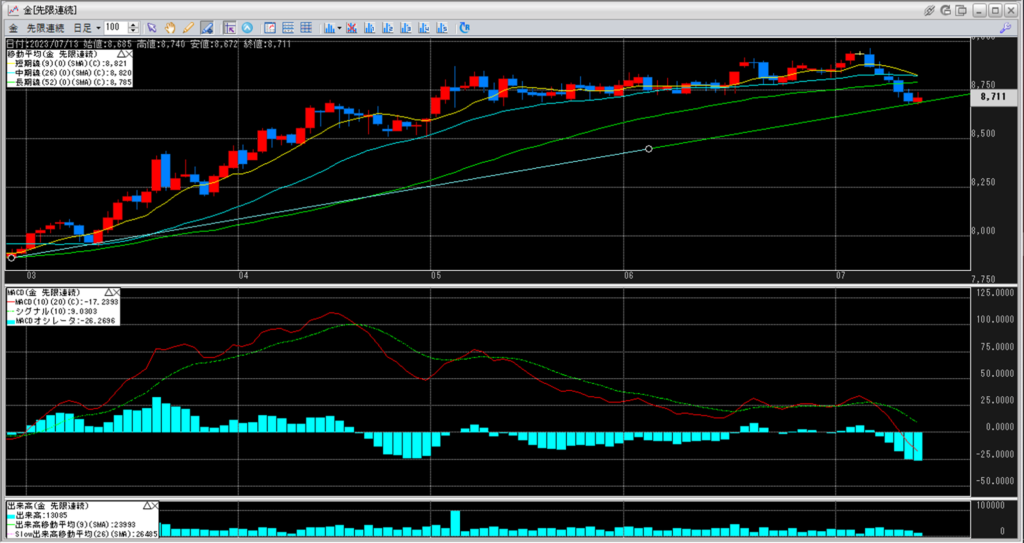 移動平均線の一番下に位置している長期線8,785円を割り込んで、