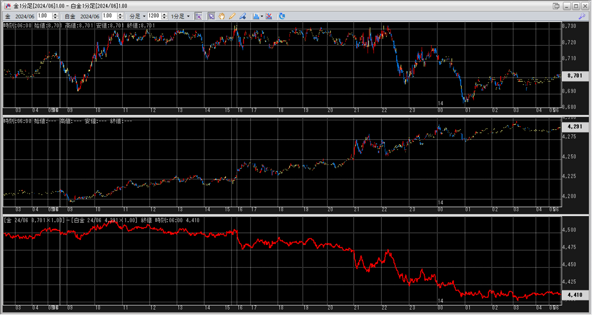 下:金白金鞘(金白金の価格差 = 金1グラムの価格 - 白金1グラムの価格)