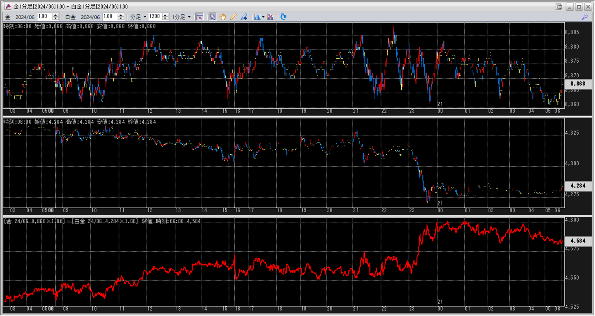 下:金白金鞘(金白金の価格差 = 金1グラムの価格 - 白金1グラムの価格)