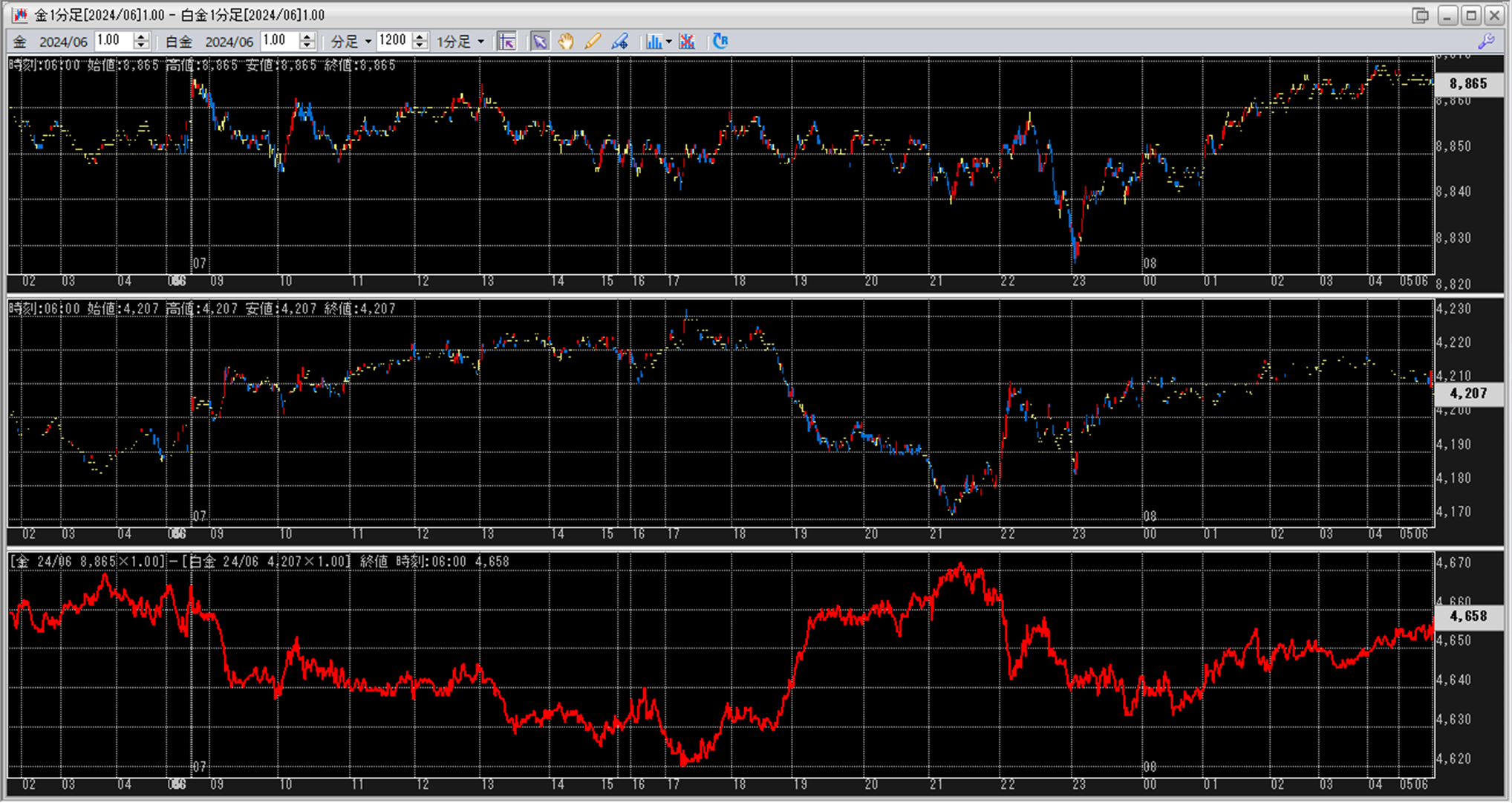 現段階では、鞘拡大の仕掛金買い1枚-白金売り2枚を1組、保持したまま、