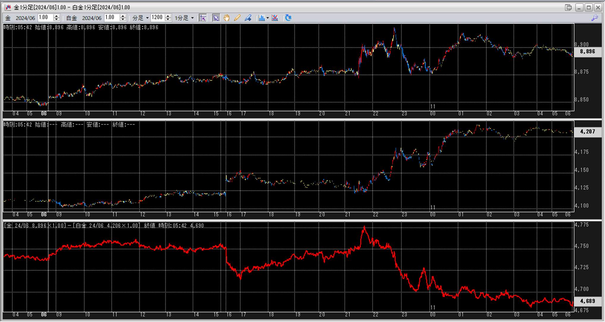 現段階では、鞘拡大の仕掛金買い1枚-白金売り2枚を1組、保持したまま、