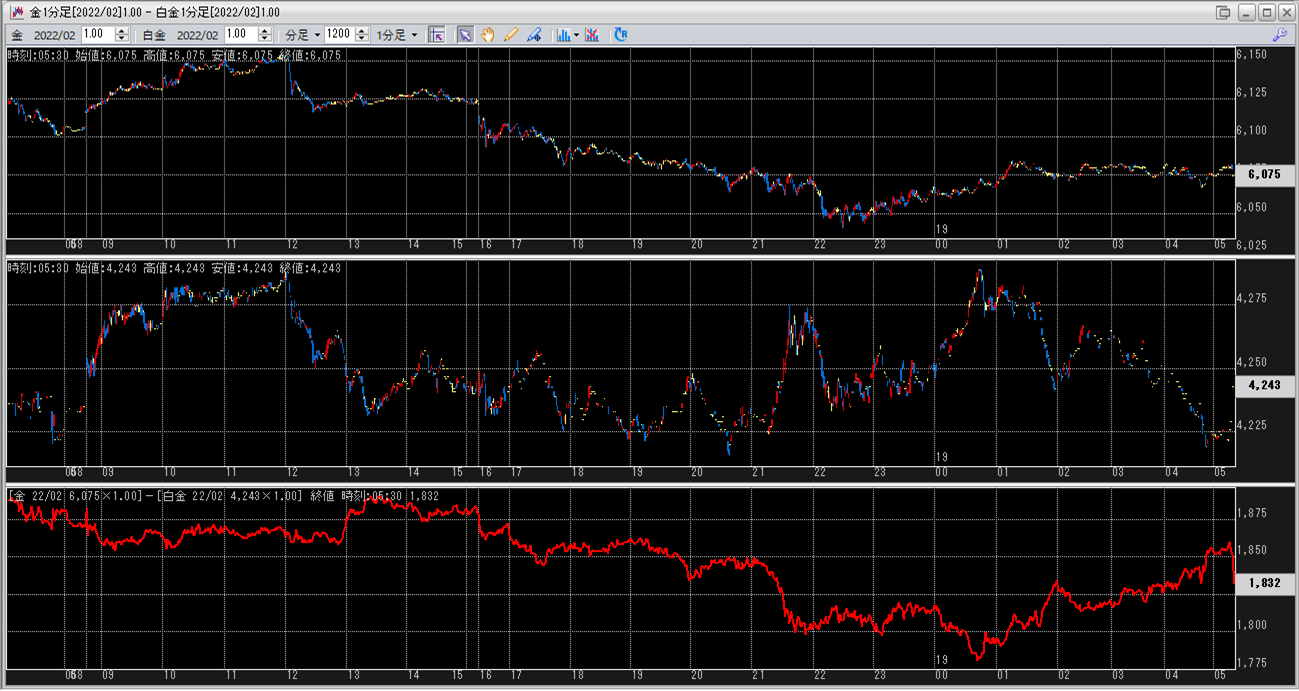 下:金白金鞘(金白金の価格差 = 金1グラムの価格 - 白金1グラムの価格)