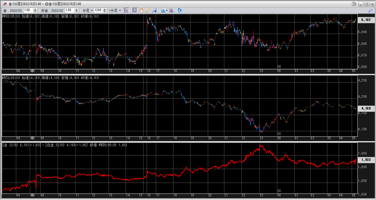 下:金白金鞘(金白金の価格差 = 金1グラムの価格 - 白金1グラムの価格)