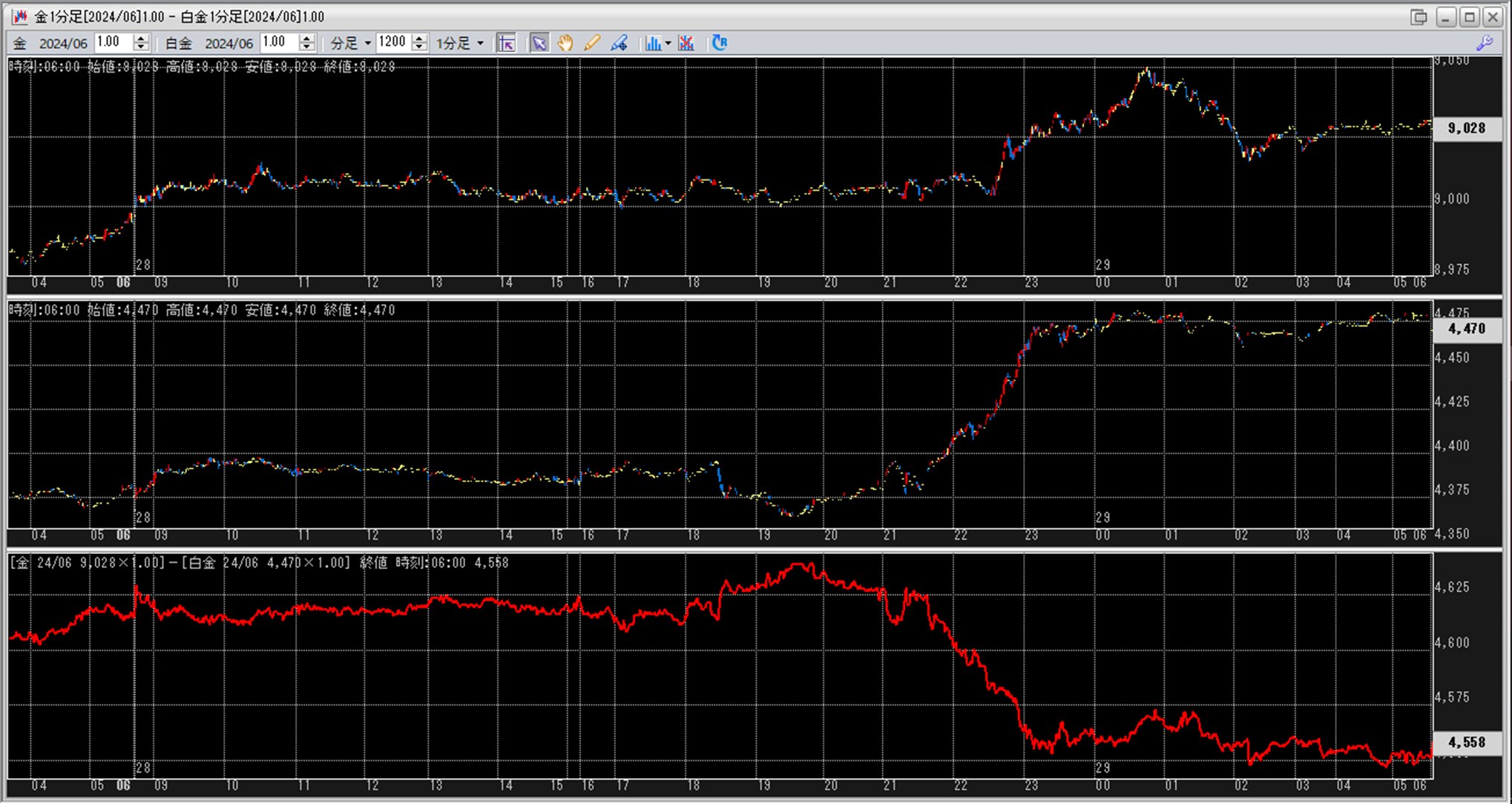 下:金白金鞘(金白金の価格差 = 金1グラムの価格 - 白金1グラムの価格)