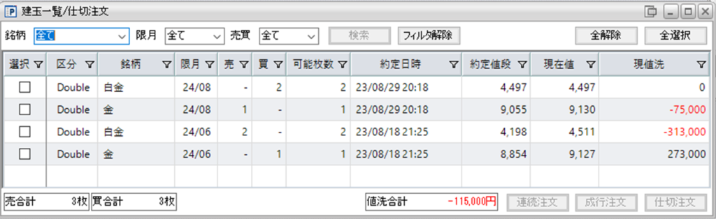 鞘縮小の仕掛け金売り1枚-白金買い2枚を1組の両建て状態に戻っています。