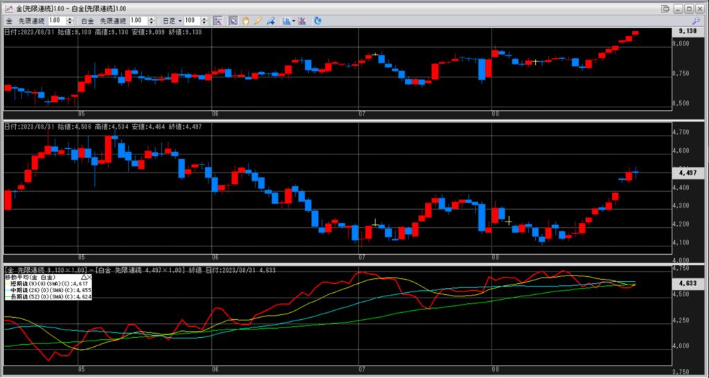 下記に金白金鞘の移動平均線のチャートを貼り付けています。
