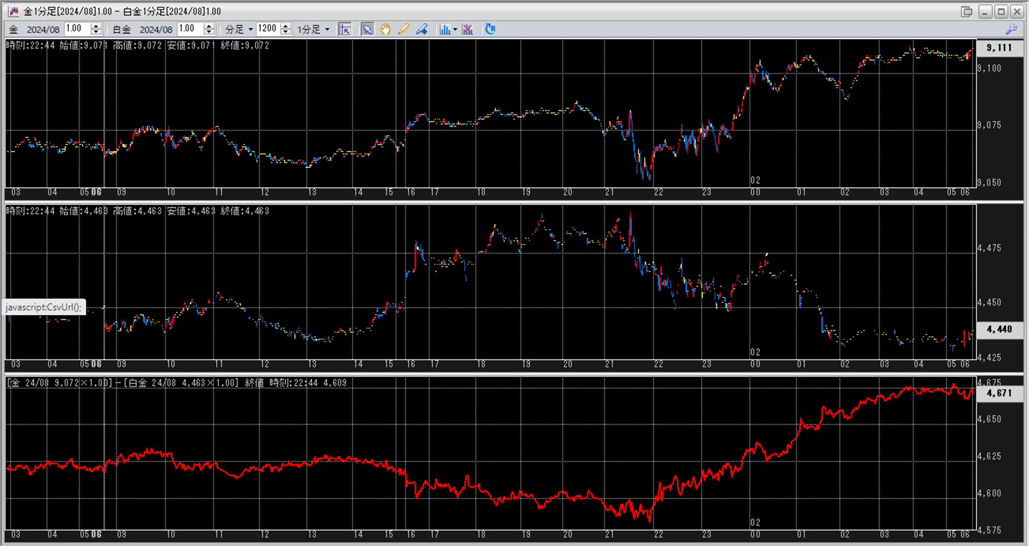 下:金白金鞘(金白金の価格差 = 金1グラムの価格 - 白金1グラムの価格)