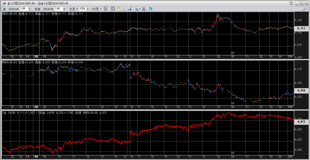 現在、鞘拡大の仕掛金買い1枚-白金売り2枚を1組を保持しています。
