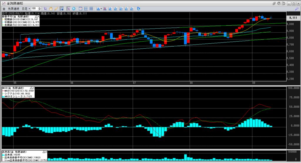 移動平均線の一番上に位置している短期線9,107円を超えて、