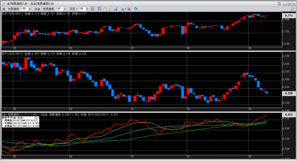 下記に金白金鞘の移動平均線のチャートを貼り付けています。