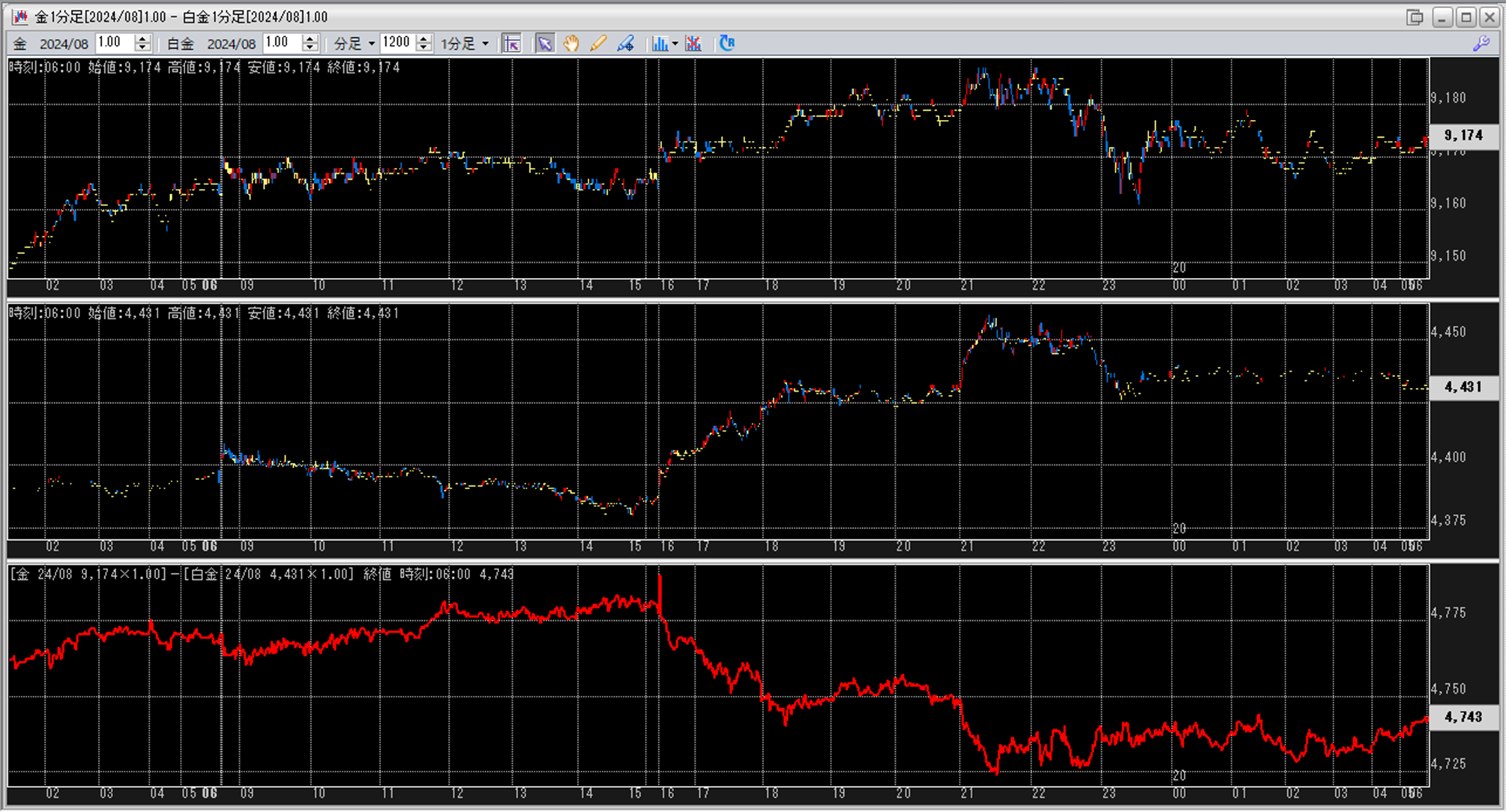 下:金白金鞘(金白金の価格差 = 金1グラムの価格 - 白金1グラムの価格)