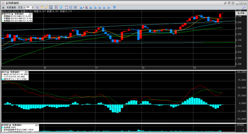 移動平均線の一番上に位置している短期線9,087円を超えて、