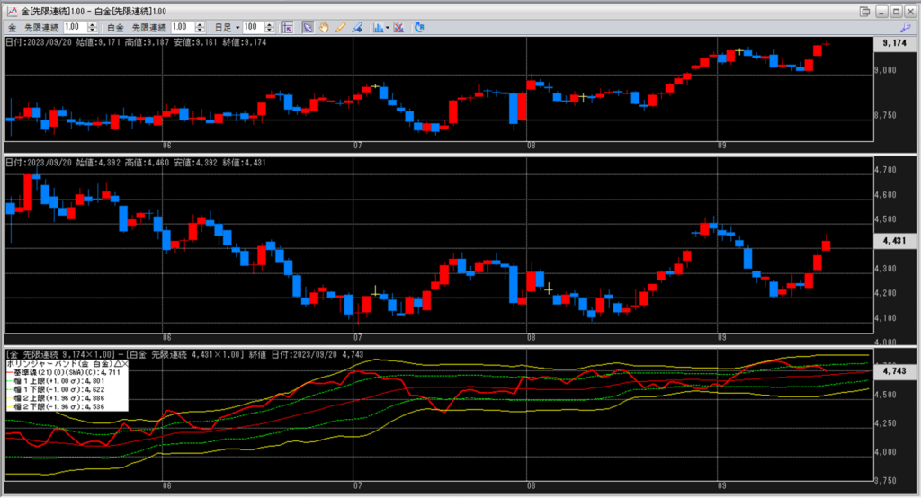 金白金の鞘をボリンジャーバンドで見ていきます。