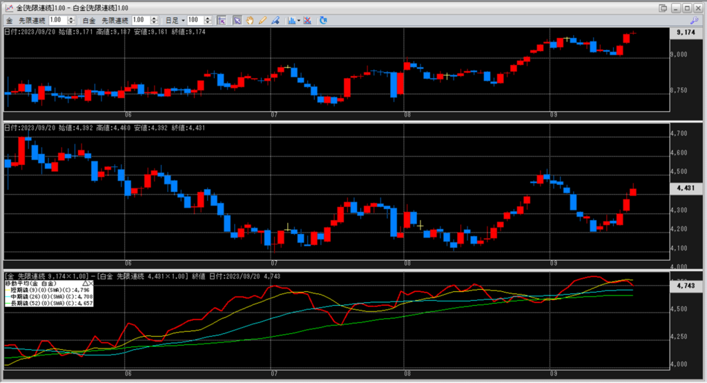 下記に金白金鞘の移動平均線のチャートを貼り付けています。