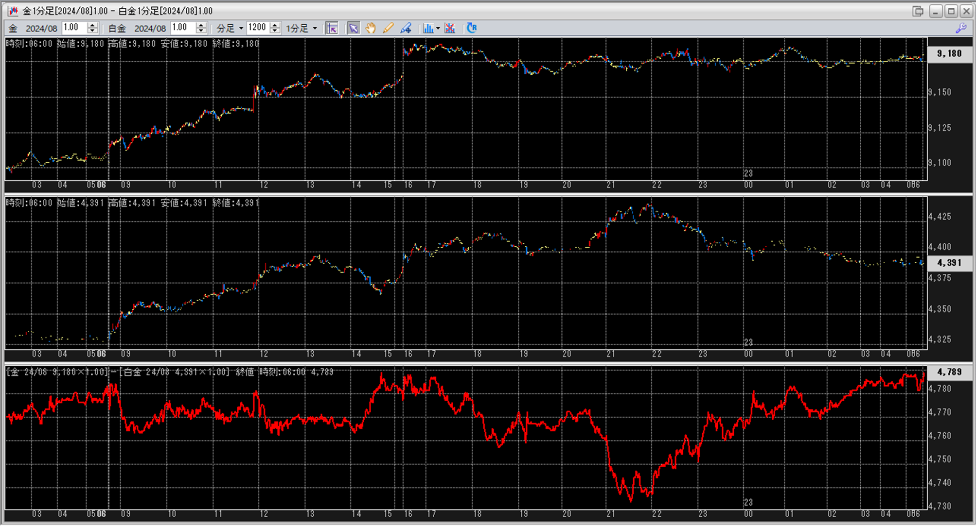 下:金白金鞘(金白金の価格差 = 金1グラムの価格 - 白金1グラムの価格)