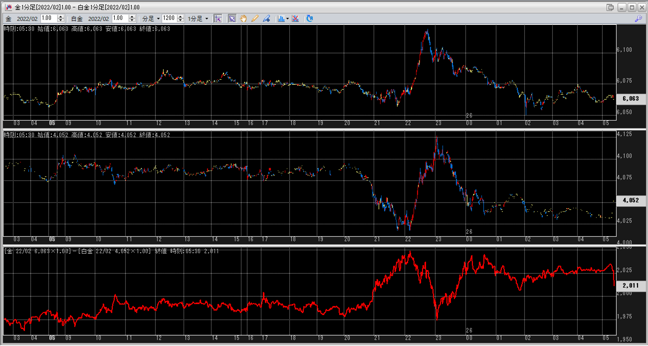 損切りし、また、金買い1枚-白金売り2枚の鞘拡大への仕掛けをしています。