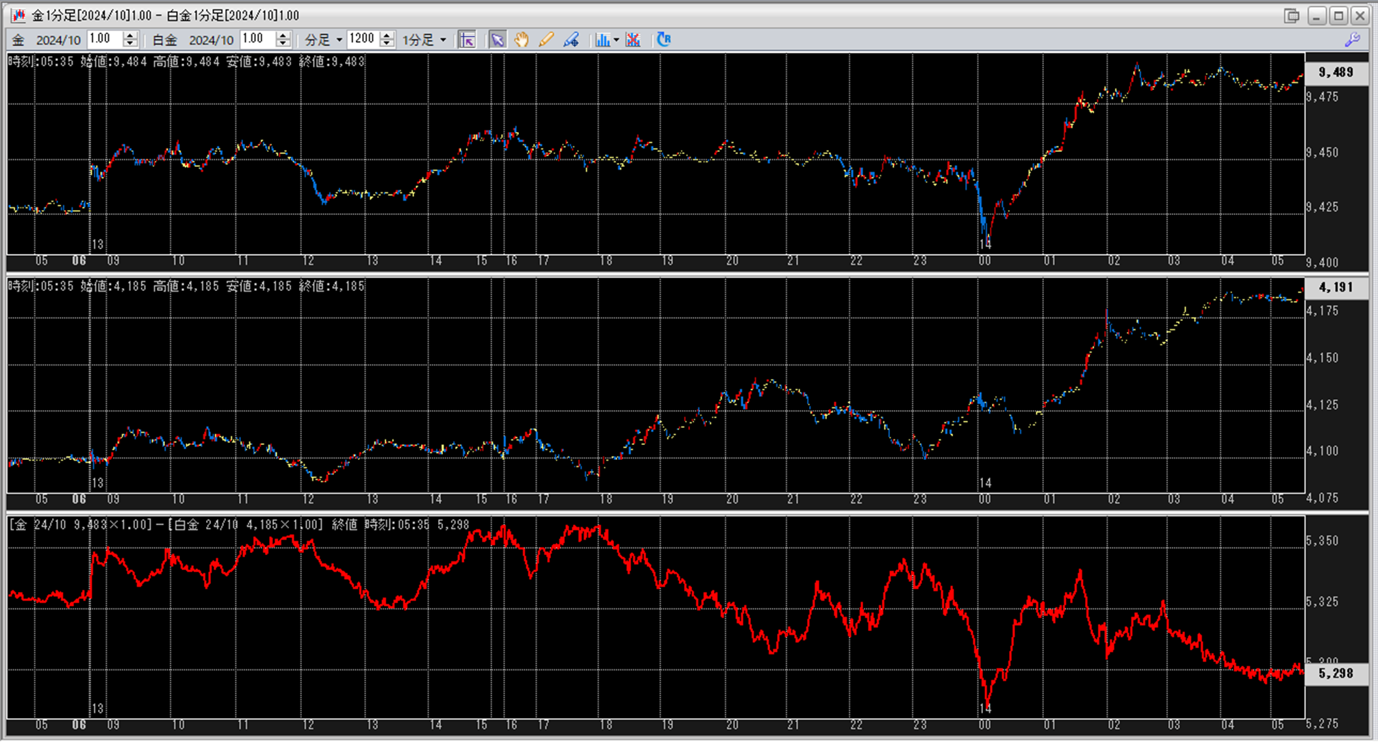 下:金白金鞘(金白金の価格差 = 金1グラムの価格 - 白金1グラムの価格)