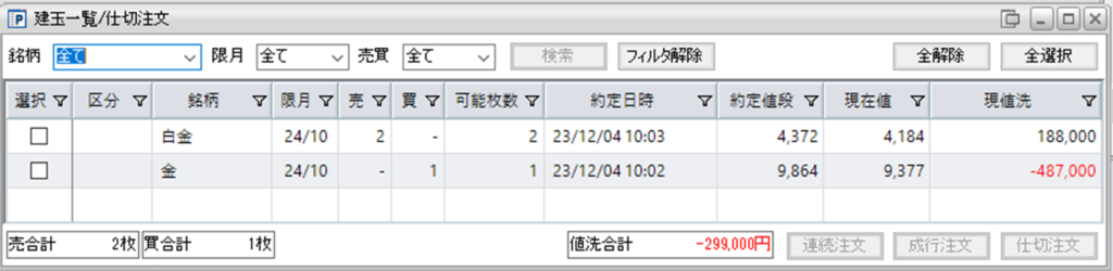 鞘拡大の仕掛け金買い1枚-白金売り2枚を1組、保持しております。