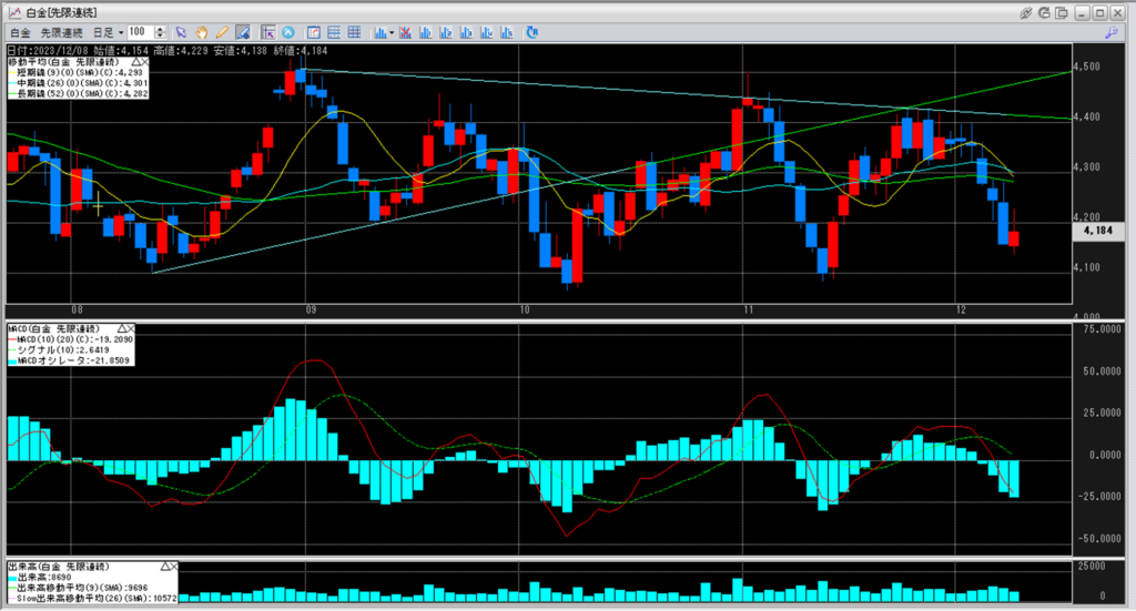 白金のチャートを見ると、4,100円から4,200円を下値とし、