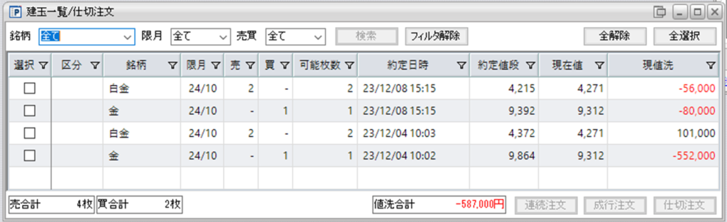 鞘拡大の仕掛け金買い1枚-白金売り2枚を2組、保持しております。