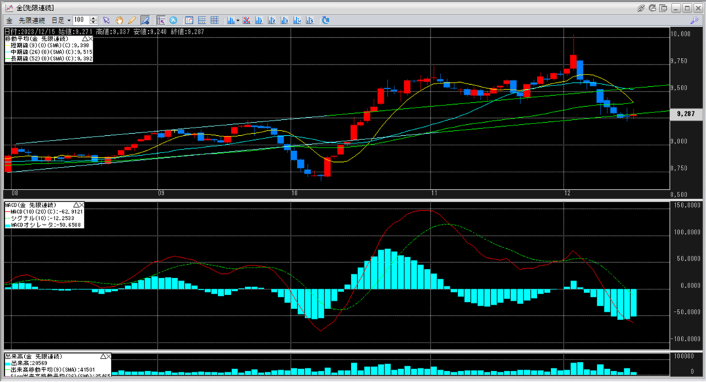 移動平均の短期線は下向き、中期線は下向き、長期線は上向きとなっています。