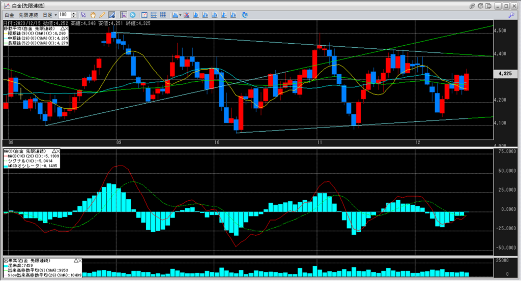 白金のチャートを見ると、4,100円から4,200円を下値とし、