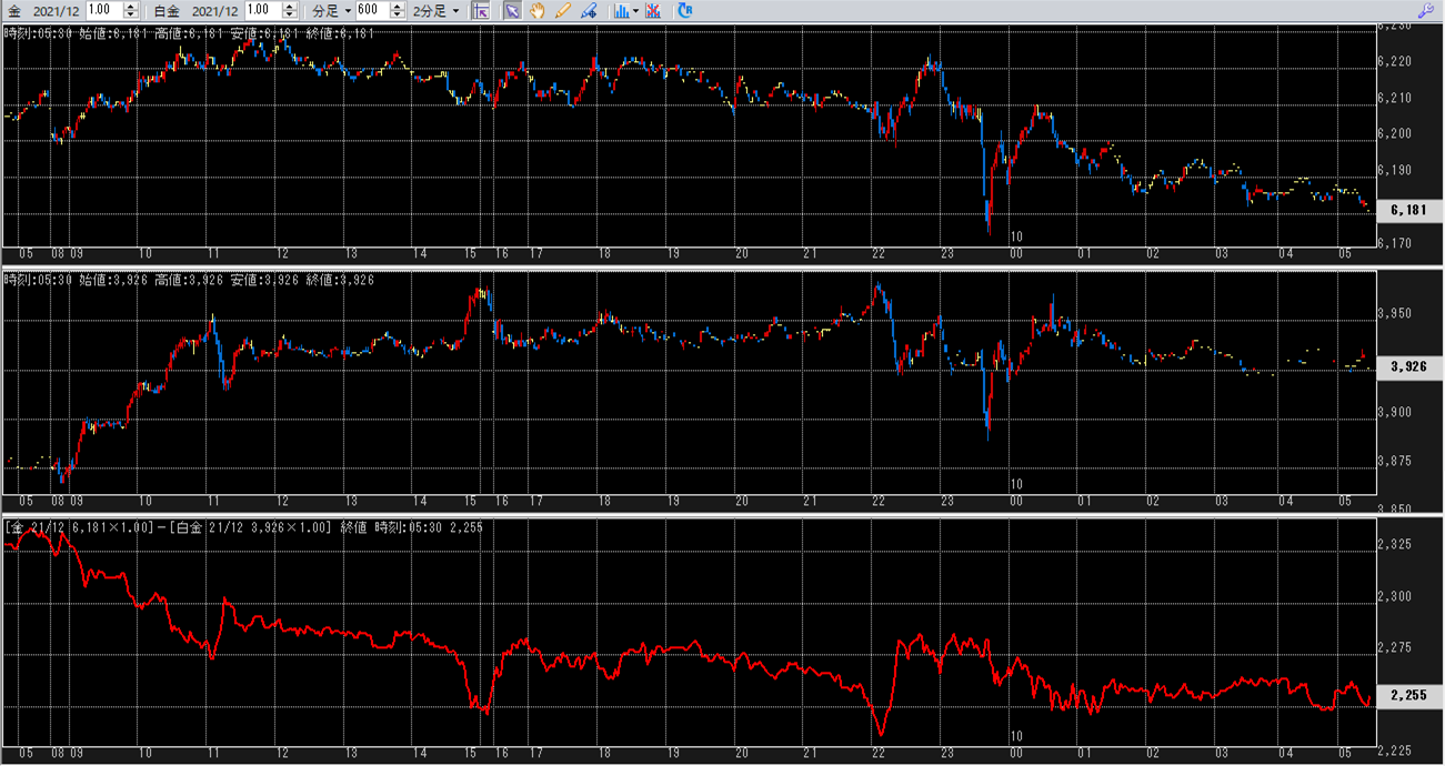 下記に2021年2月9日8:45~2月10日5:30 金白金鞘値動きのチャートを張り付けています。
