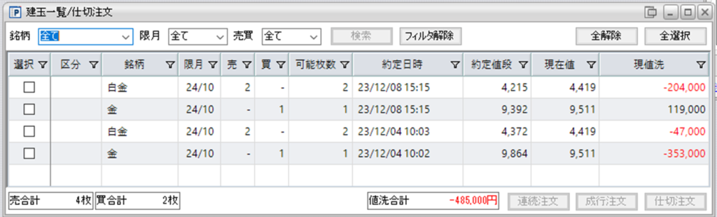 鞘拡大の仕掛け金買い1枚-白金売り2枚を2組、保持しております。