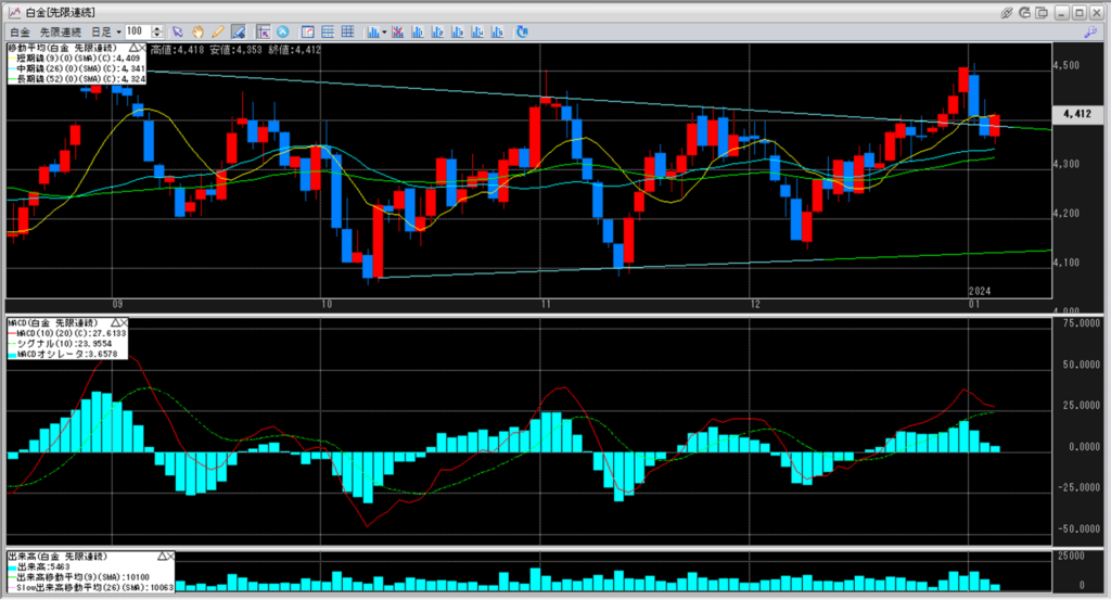 白金のチャートを見ると、4,100円から4,200円を下値とし、