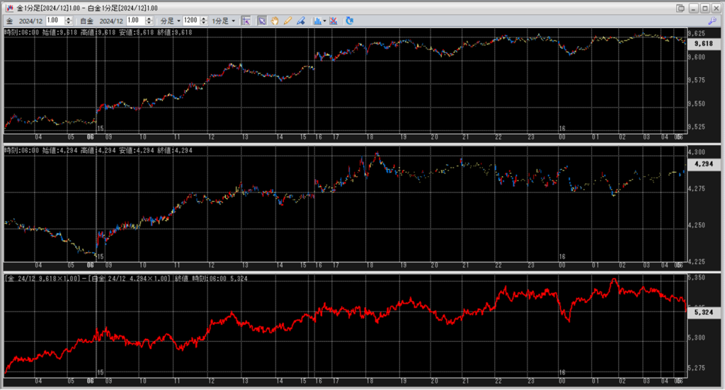 下:金白金鞘(金白金の価格差 = 金1グラムの価格 - 白金1グラムの価格)