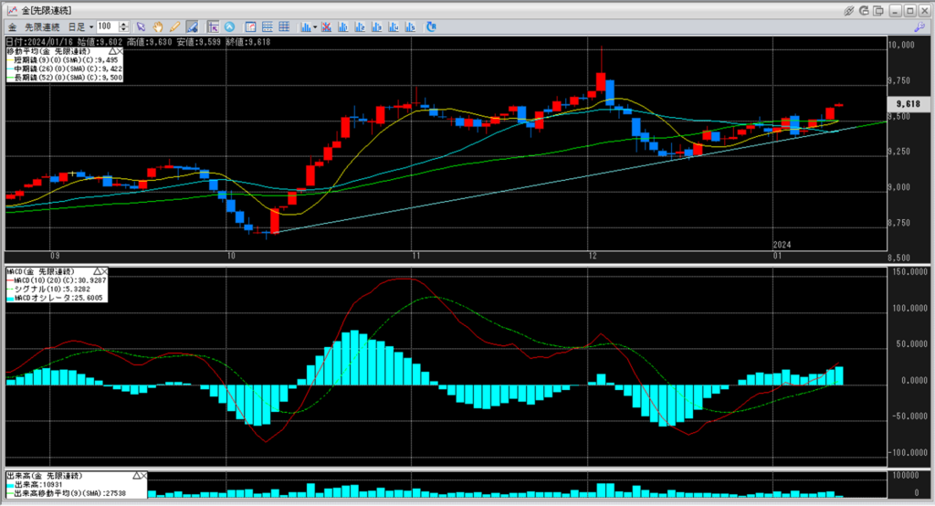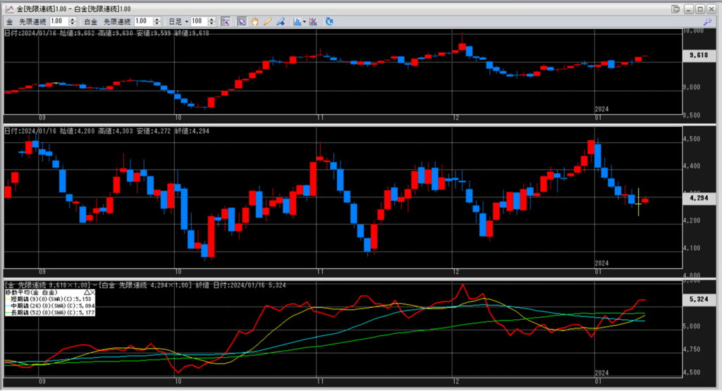 下記に金白金鞘の移動平均線のチャートを貼り付けています。