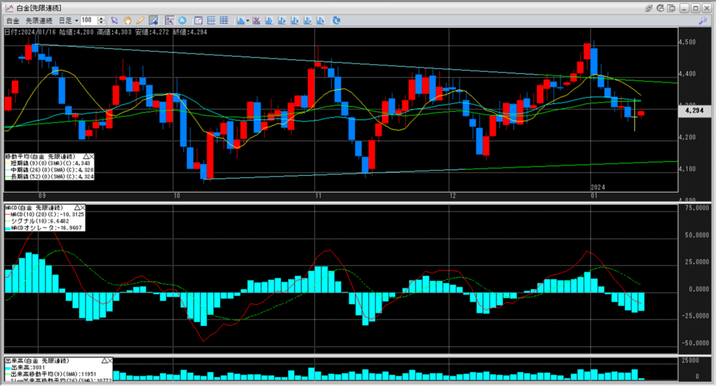 白金のチャートを見ると、4,100円から4,200円を下値とし、
